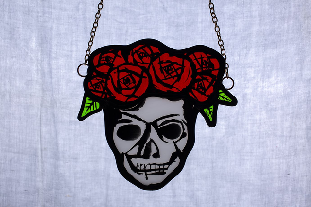 Celebrate the rich traditions of the Day of the Dead with our stunning stained glass piece, featuring a captivating Day of the Dead skull adorned with a crown of vibrant red roses. This exquisite artwork measures approximately 16cm x 16cm, meticulously crafted to embody the essence of this iconic cultural celebration.