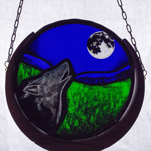 Elevate your decor with our captivating Stained Glass Wolf Howling at the Moon Roundel! This enchanting piece brings the mystical allure of the night sky into your space, featuring a magnificent wolf, elegantly howling at the moon.