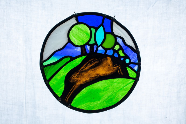 Having cut each of the glass elements the hare was painted and underwent 3 firings to complete. Once all painting and cutting was completed copper foiling and leading began before finally cementing and polishing up the leads to give the distinctive black lines.