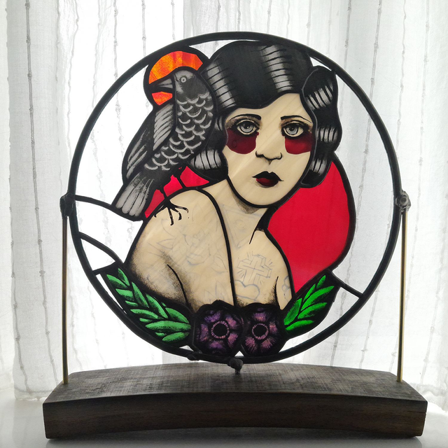 Experience the fusion of traditional tattoo artistry and contemporary techniques in this exquisite copper foiled decoration. With a perfect harmony of traditional painting, modern high fire enamels, textured glass, copper foil, and expert lead work, this one-of-a-kind piece captures the essence of artistic innovation.